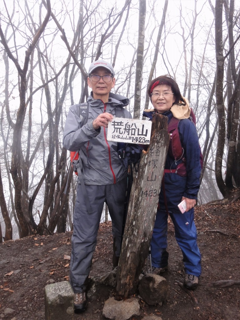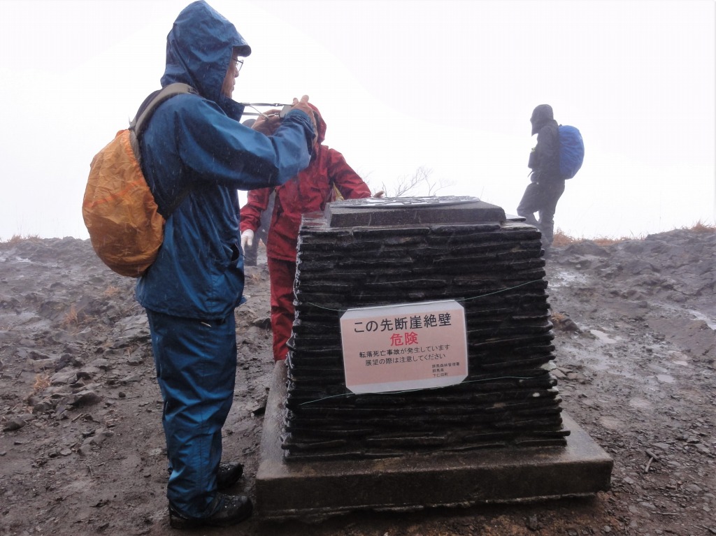 2日目もあいにく1日中小雨が降って、登山道は所々ぬかるんでいて、坂がきつくなるとつるつる滑って大変難儀した。最高峰の直前の急登を苦労しながら登り、1423mの経塚山に到着した。