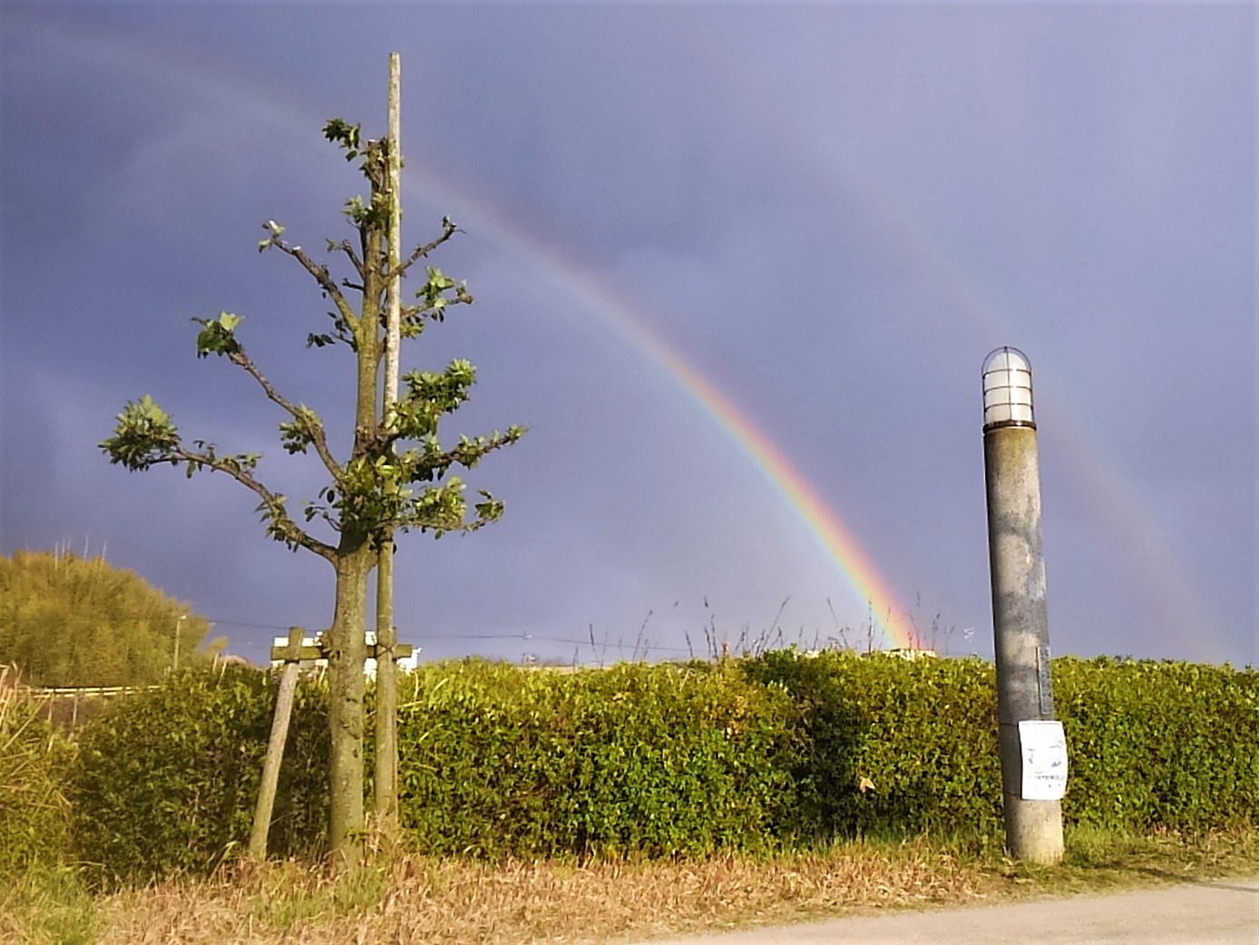 3月15日(日)4:05に家を出て、パークロードのジョッギングに出かけた。梅の花は完全に散ってしまい、桜のつぼみはまだ固い。昨日までは大変暖かかったが、今日は風が冷たい。特に帰りの北風は向かい風で厳しい。ほとんど終わるころ、その北風に乗って小雨がぱらついてきた。降ったのはほんのわずかの間だけで、すぐに止んでしまった。ふと右手を見ると、知多翔洋高校の校舎の上のところに鮮やかな虹が出ていた、よく見ると二重になっていた。久しぶりに虹を見た。何か良いことがあるのかな。