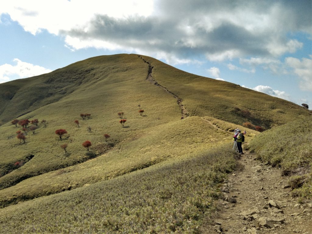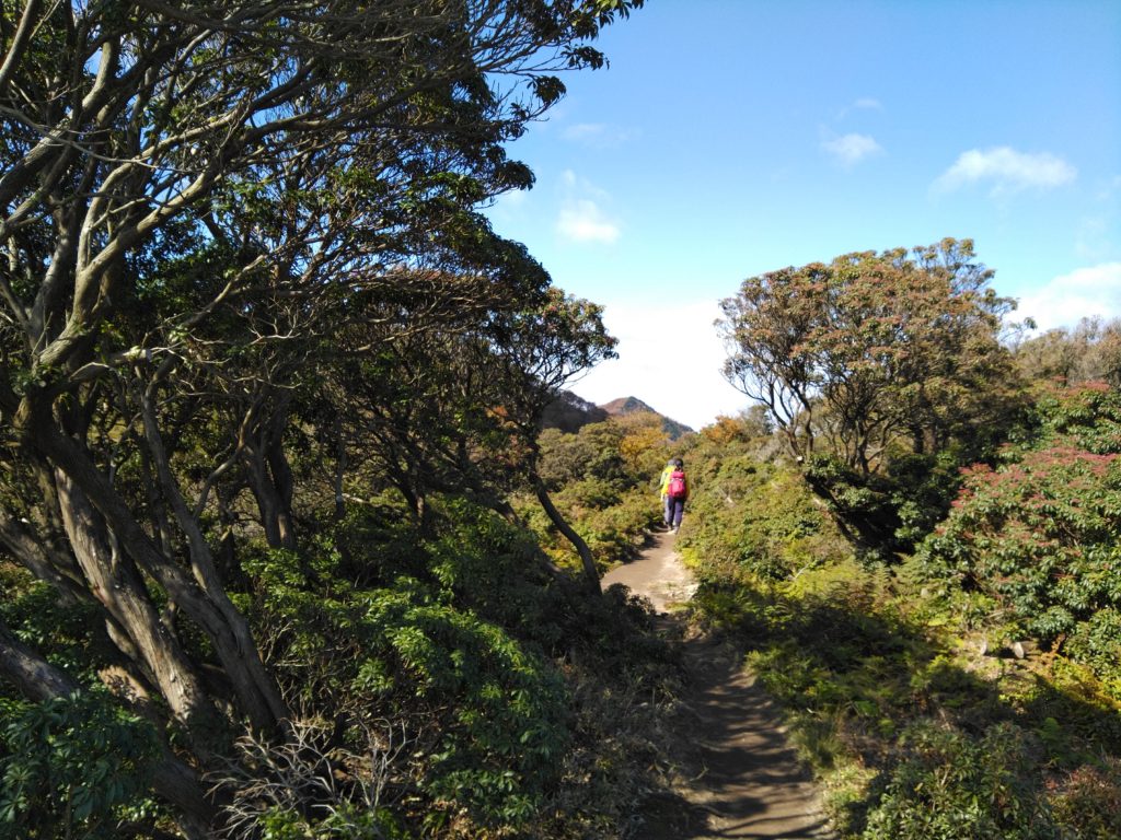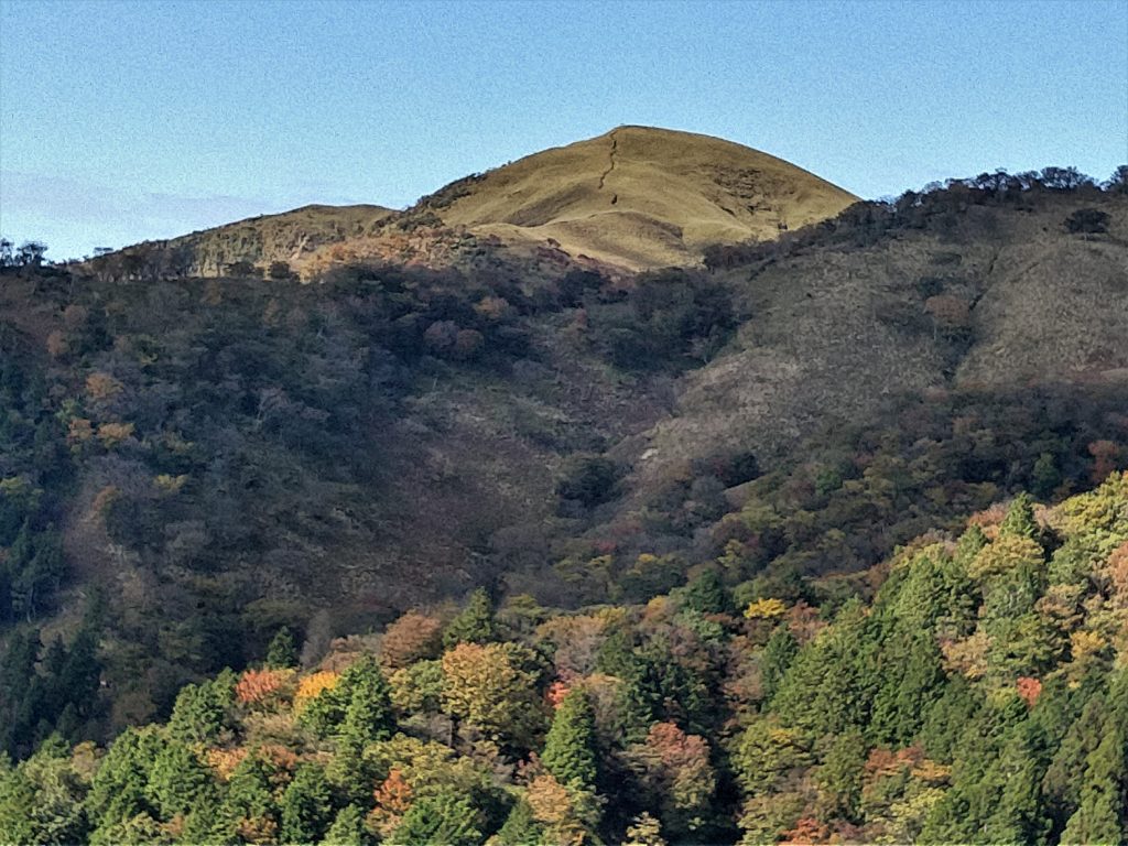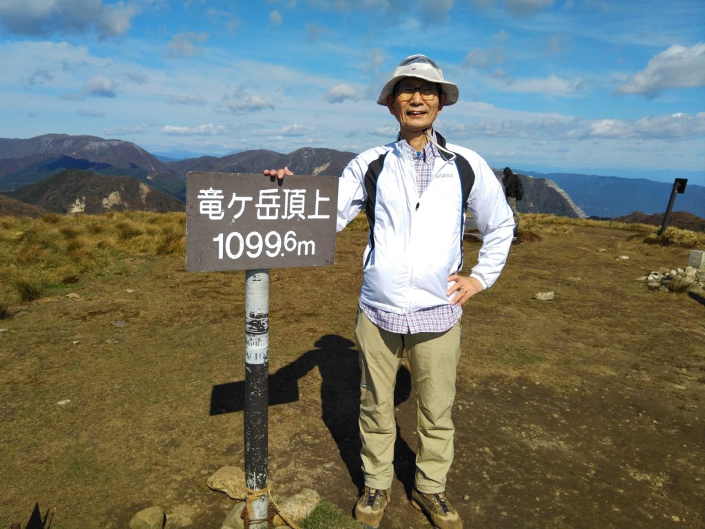 10月30日(金)三重県の「竜ヶ岳」に妻と登った。宇賀渓駐車場に車を止めて、8:00歩き始めた。まずは30分ほど林道を進み、「滝の雫」を見て、少し進んで、遠足尾根入り口から登山開始。杉林を通り、岩の多いカレンフェルト地帯を過ぎるとやせ尾根の「遠足尾根」になった。さらに進むと、見晴らしの良い笹の中の道を歩くことになった。「赤い羊」と呼ばれる白ヤシオの紅葉がとても素晴らしかった。ちょうど12時に頂上に着いた。風が強いので、風の当たらないところで景色を楽しみながら昼食をとった。帰りは「金山尾根」を下ったが、ガレ道で、転ばないように必死に下りた。「魚止滝」を見て、朝来た林道を通り、3時に無事下山した。