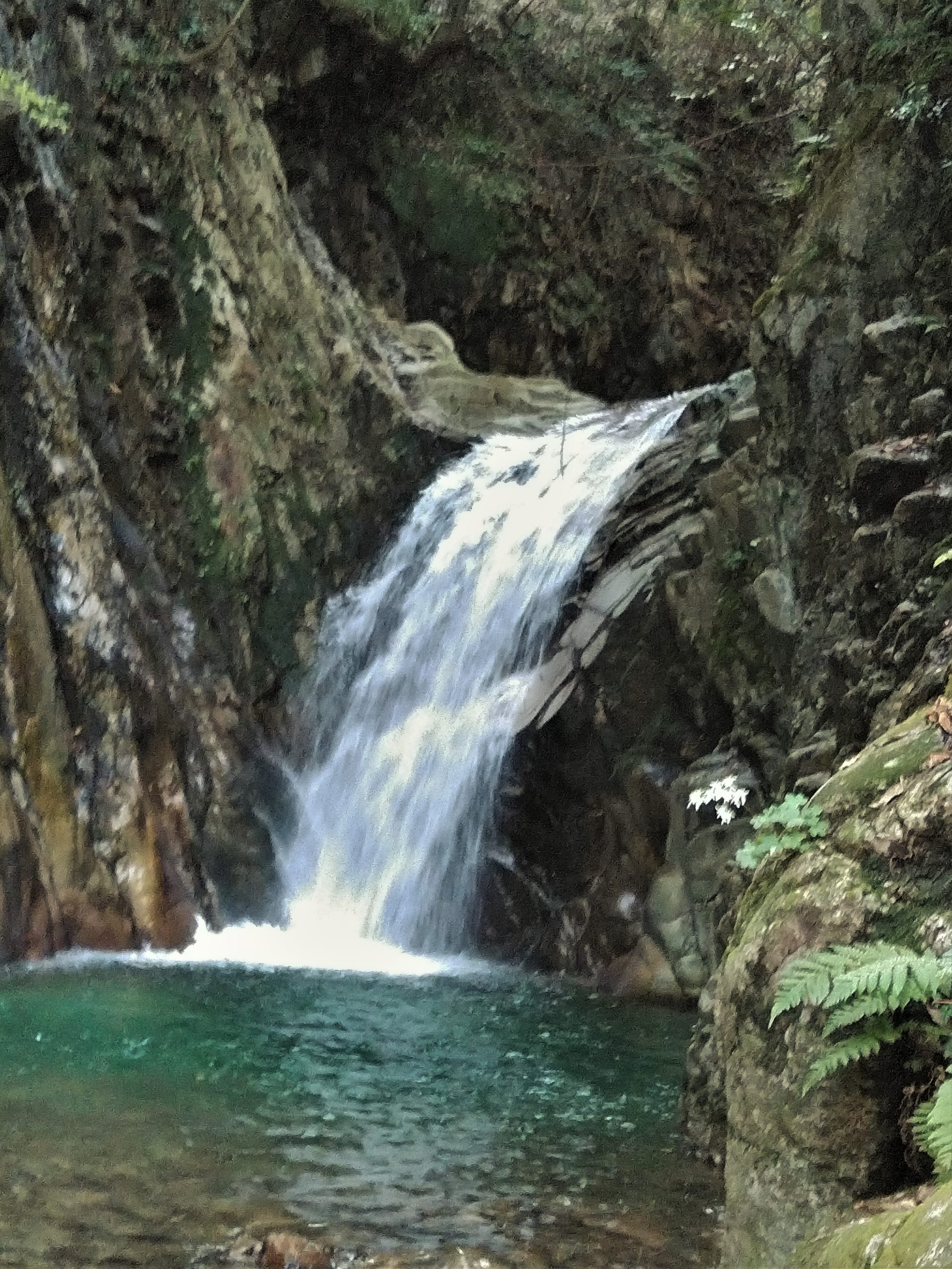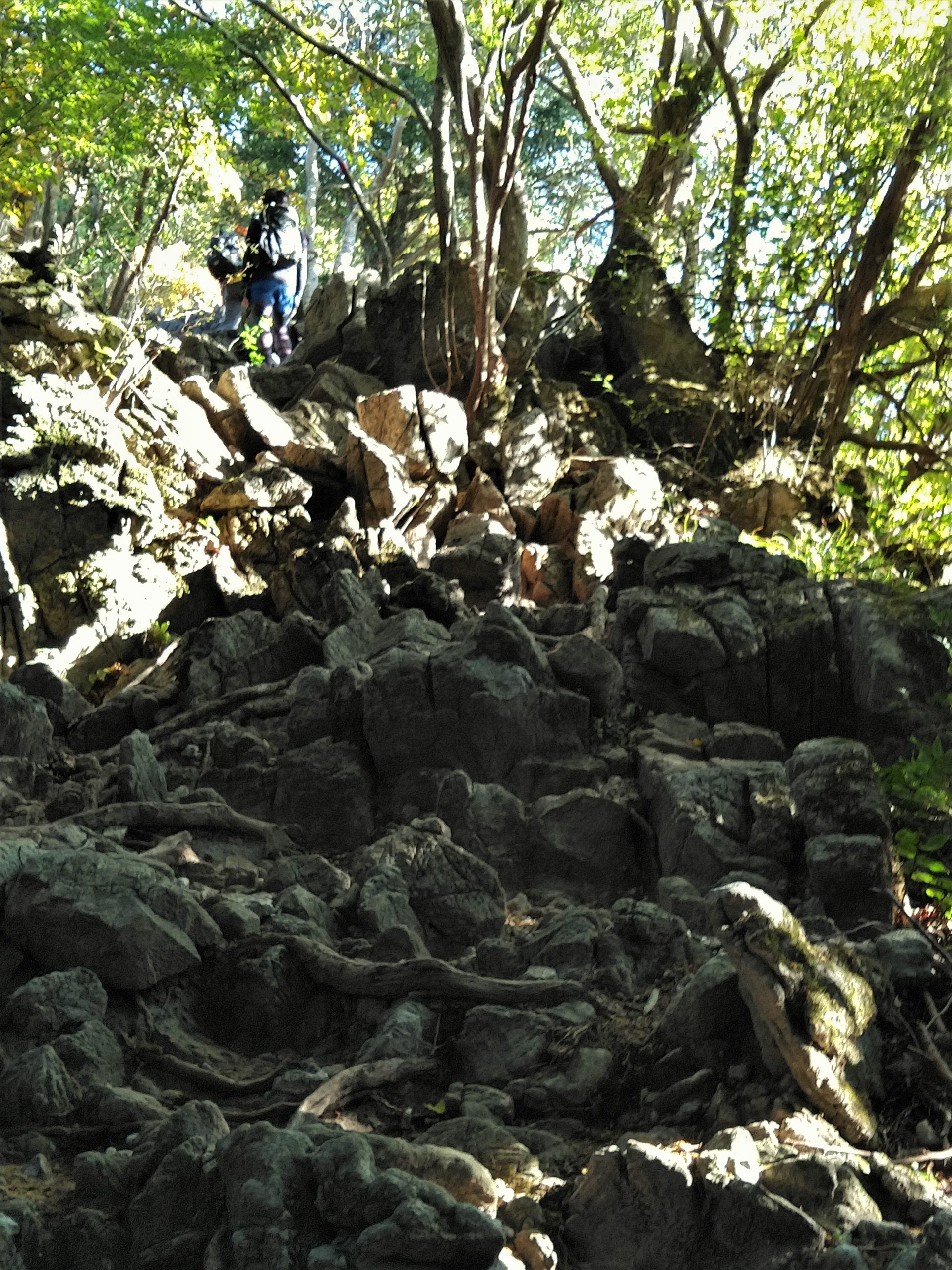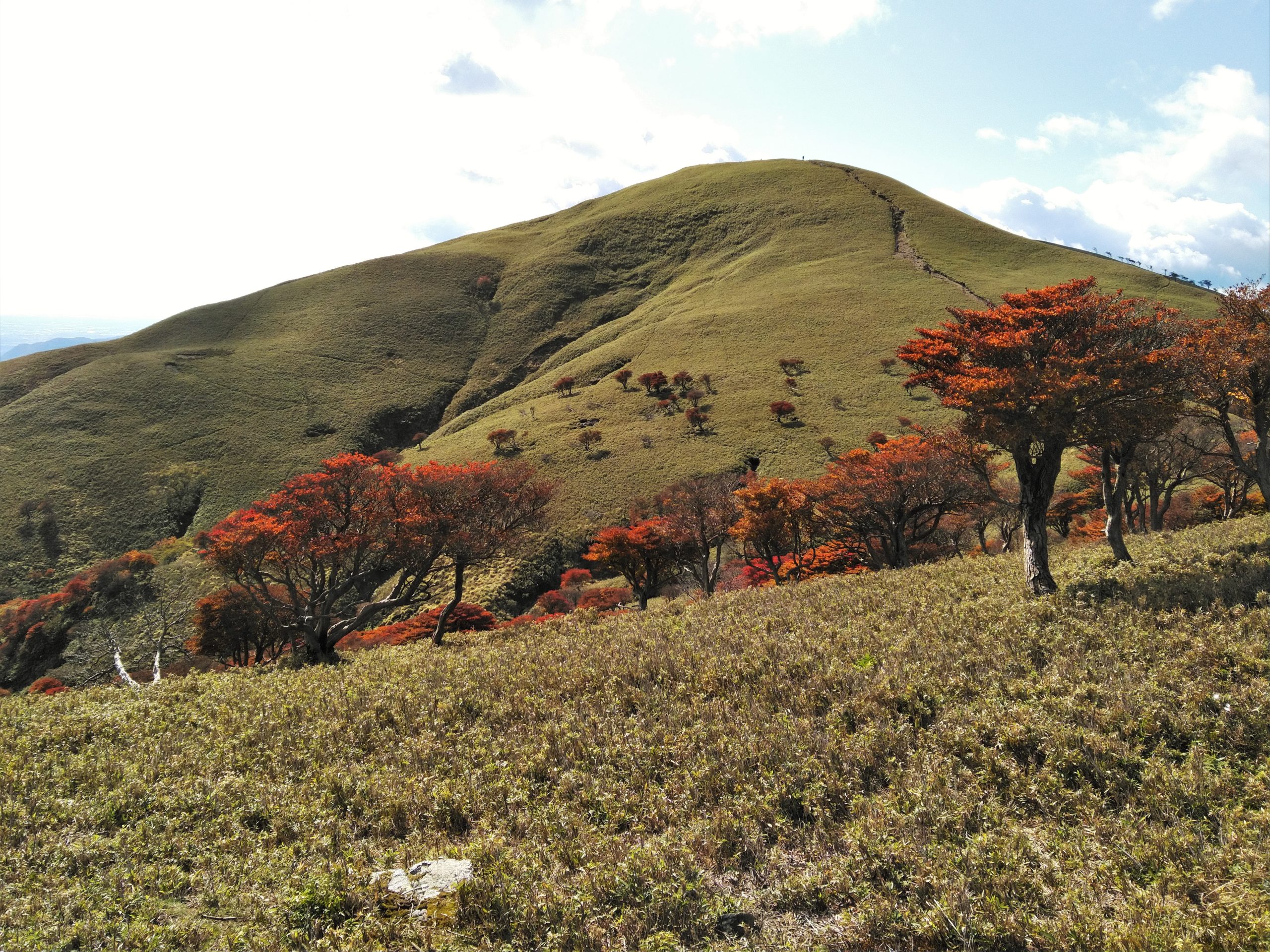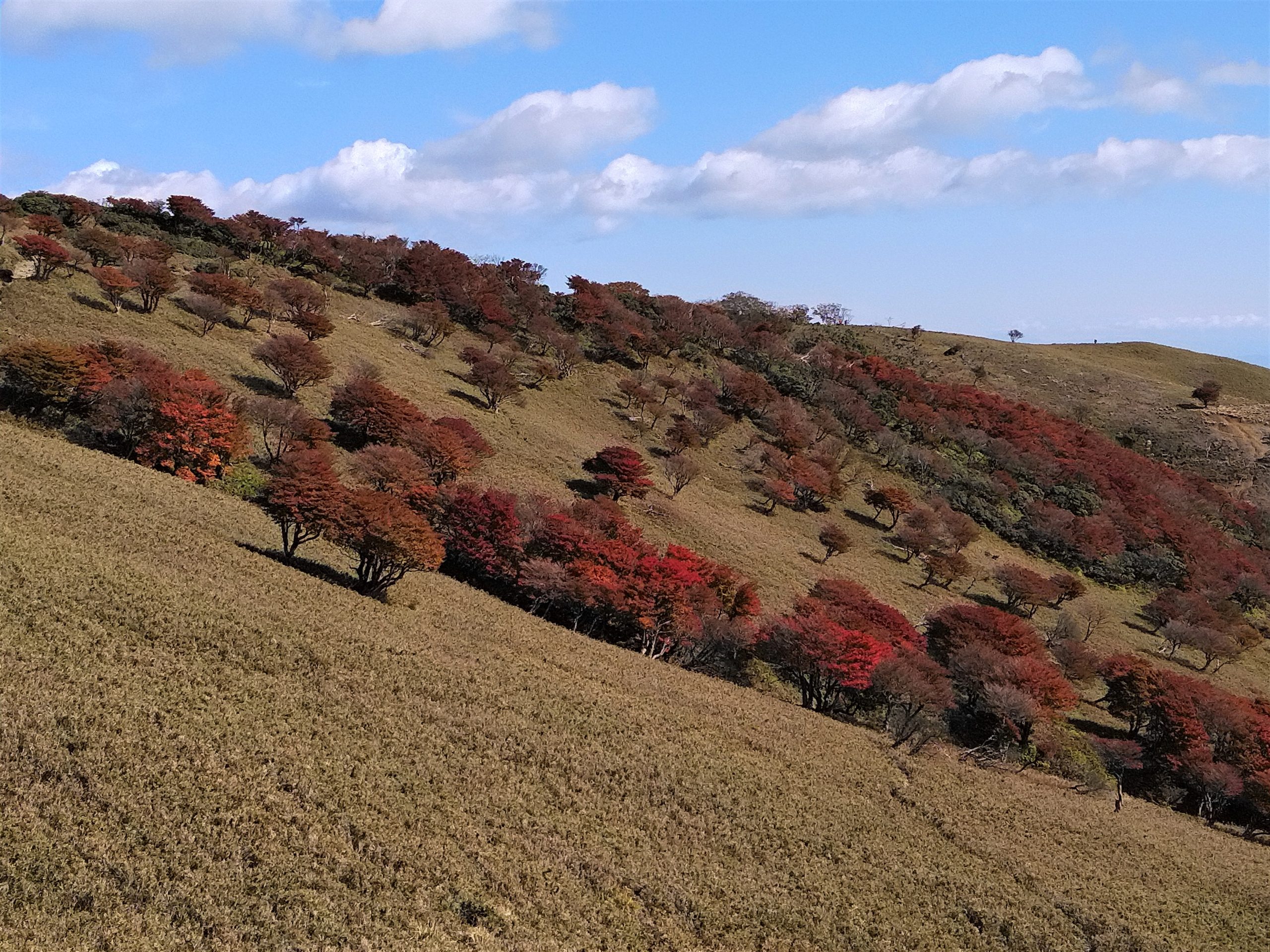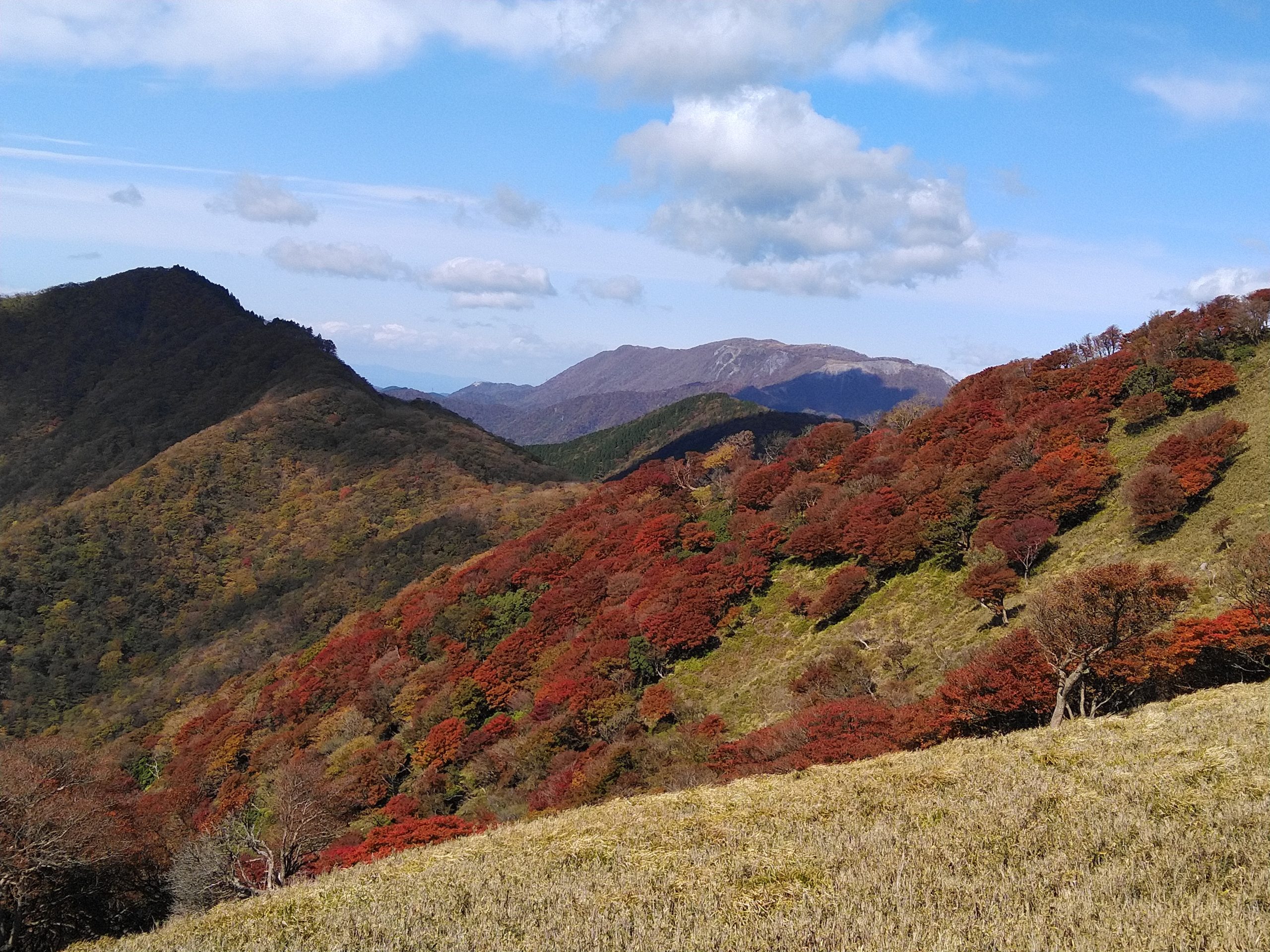 10月30日(金)三重県の「竜ヶ岳」に妻と登った。宇賀渓駐車場に車を止めて、8:00歩き始めた。まずは30分ほど林道を進み、「滝の雫」を見て、少し進んで、遠足尾根入り口から登山開始。杉林を通り、岩の多いカレンフェルト地帯を過ぎるとやせ尾根の「遠足尾根」になった。さらに進むと、見晴らしの良い笹の中の道を歩くことになった。「赤い羊」と呼ばれる白ヤシオの紅葉がとても素晴らしかった。ちょうど12時に頂上に着いた。風が強いので、風の当たらないところで景色を楽しみながら昼食をとった。帰りは「金山尾根」を下ったが、ガレ道で、転ばないように必死に下りた。「魚止滝」を見て、朝来た林道を通り、3時に無事下山した。