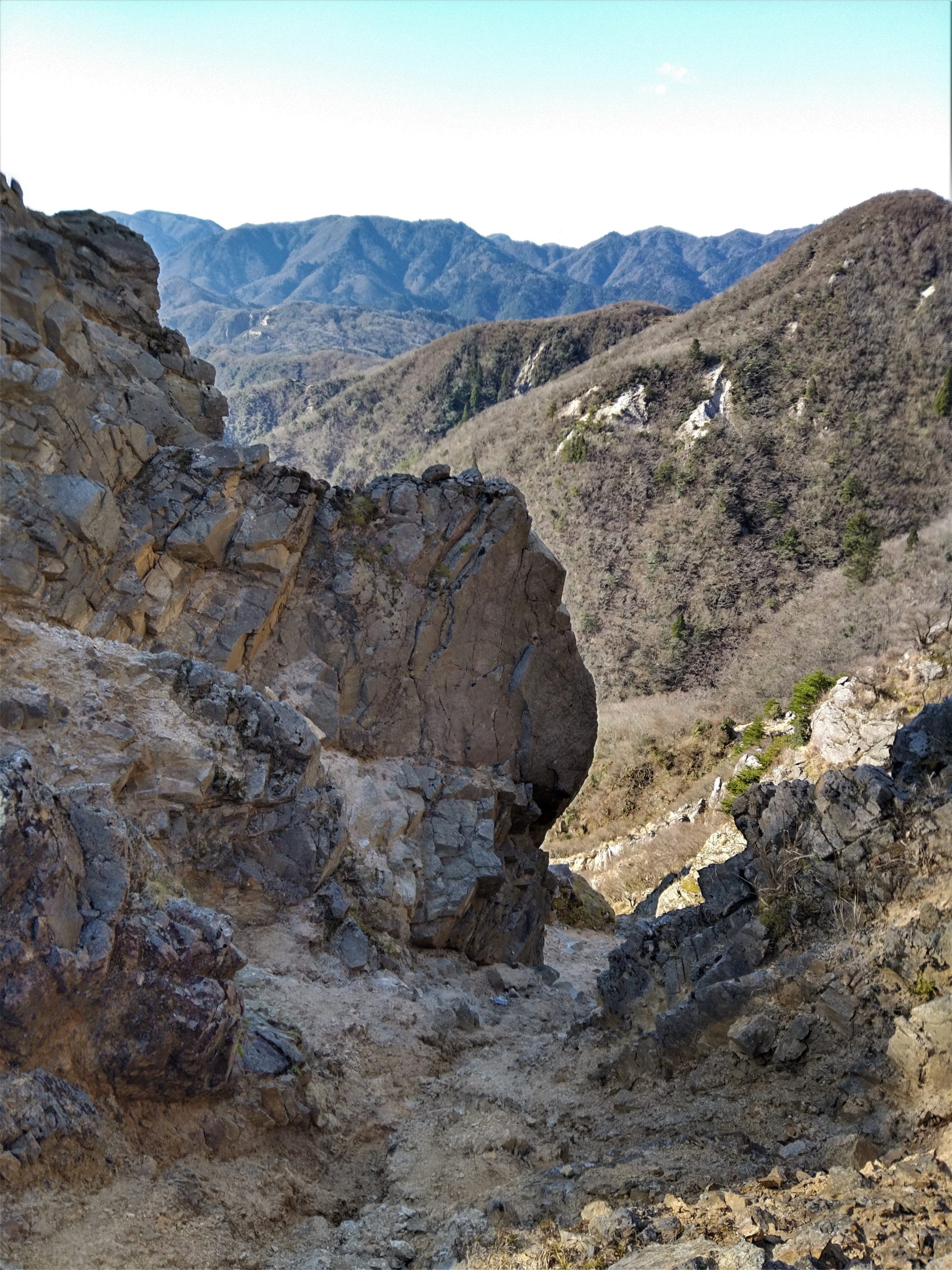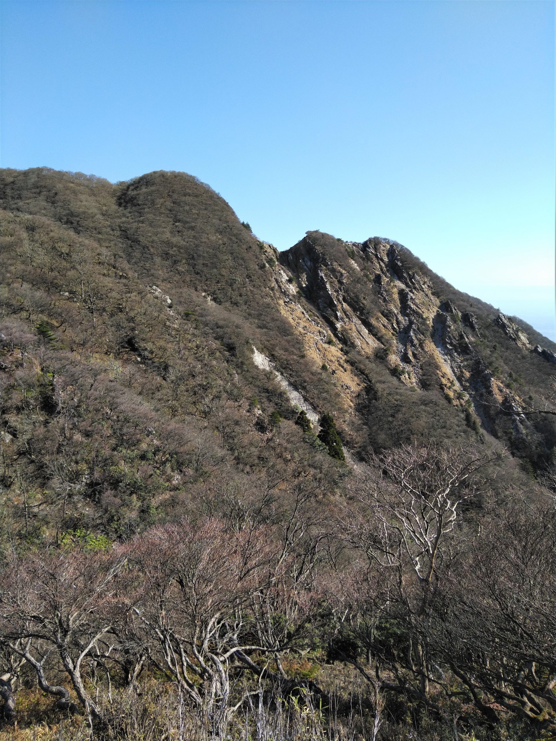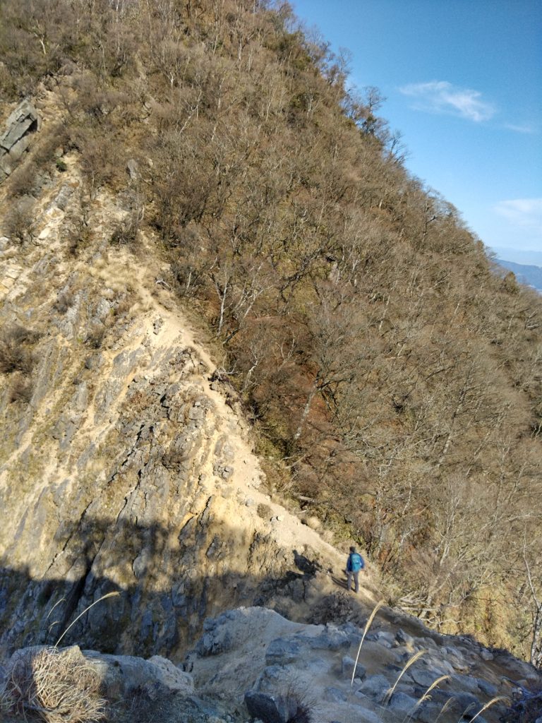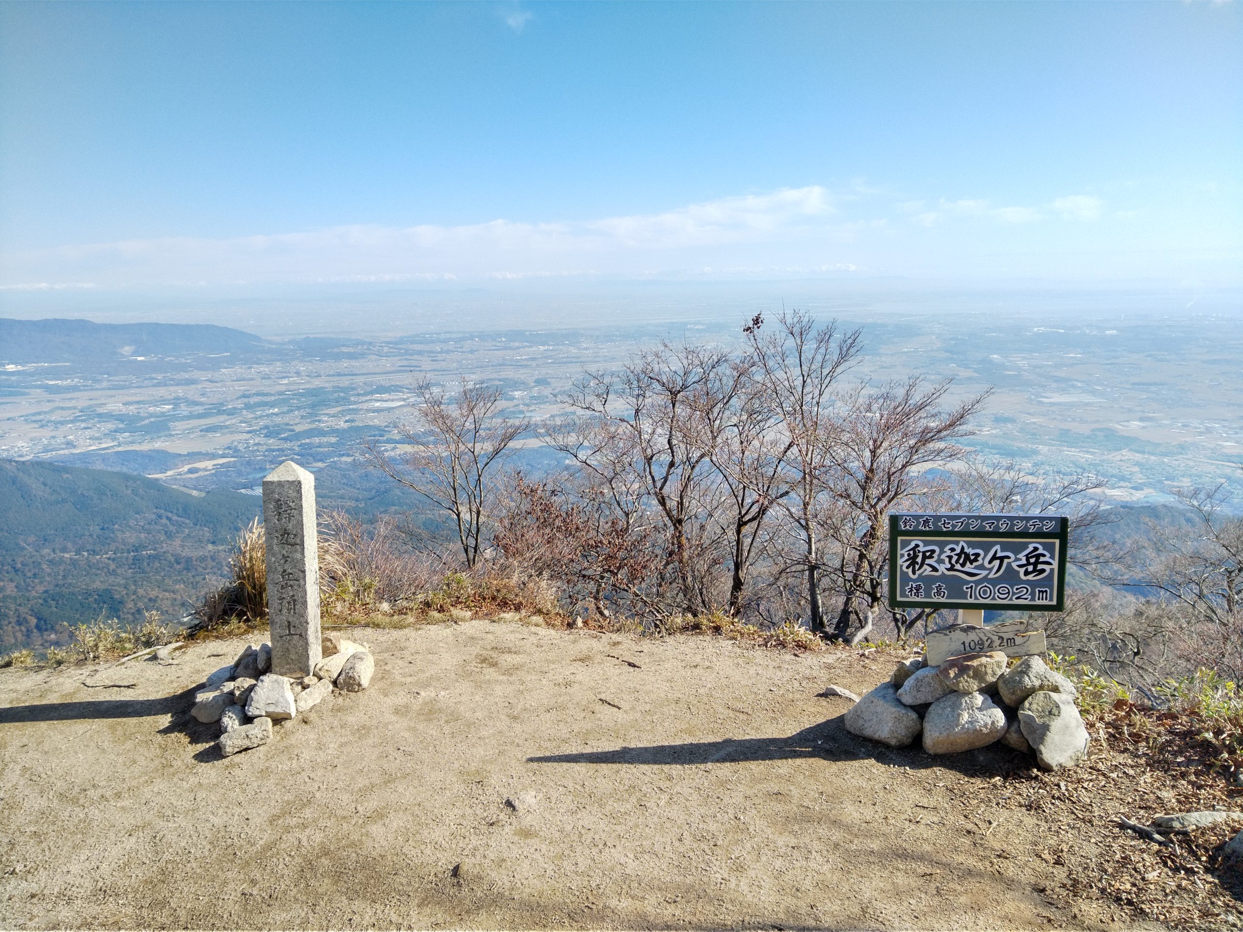 11月27日(金)8:00朝明駐車場に車を止めて、登山届を出して、中尾根登山口を目指した。樹林帯のジグザグ道を上り、花崗岩のやせ尾根を進み鳴滝コバで小休止。急登を上ったり下りたりしながら松尾尾根を過ぎると、最大の難関「大蔭のガレ」に出た。慎重に通り過ぎてさらに急登を上ると、1097mの釈迦ヶ岳最高点「松尾尾根の頭」に着いた。そこで早めの昼食を食べて、少し先にある1092m「釈迦ヶ岳」山頂を目指した。快晴に恵まれて素晴らしい伊勢湾や遠く名古屋のビルまで見える展望を楽しんだ。帰路は「猫岳」を通り、大蔭のガレを振り返りながら展望の良い猫谷コースを下りた。