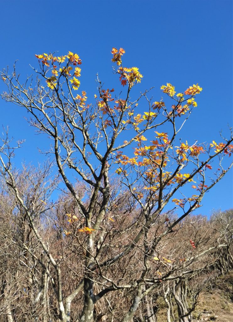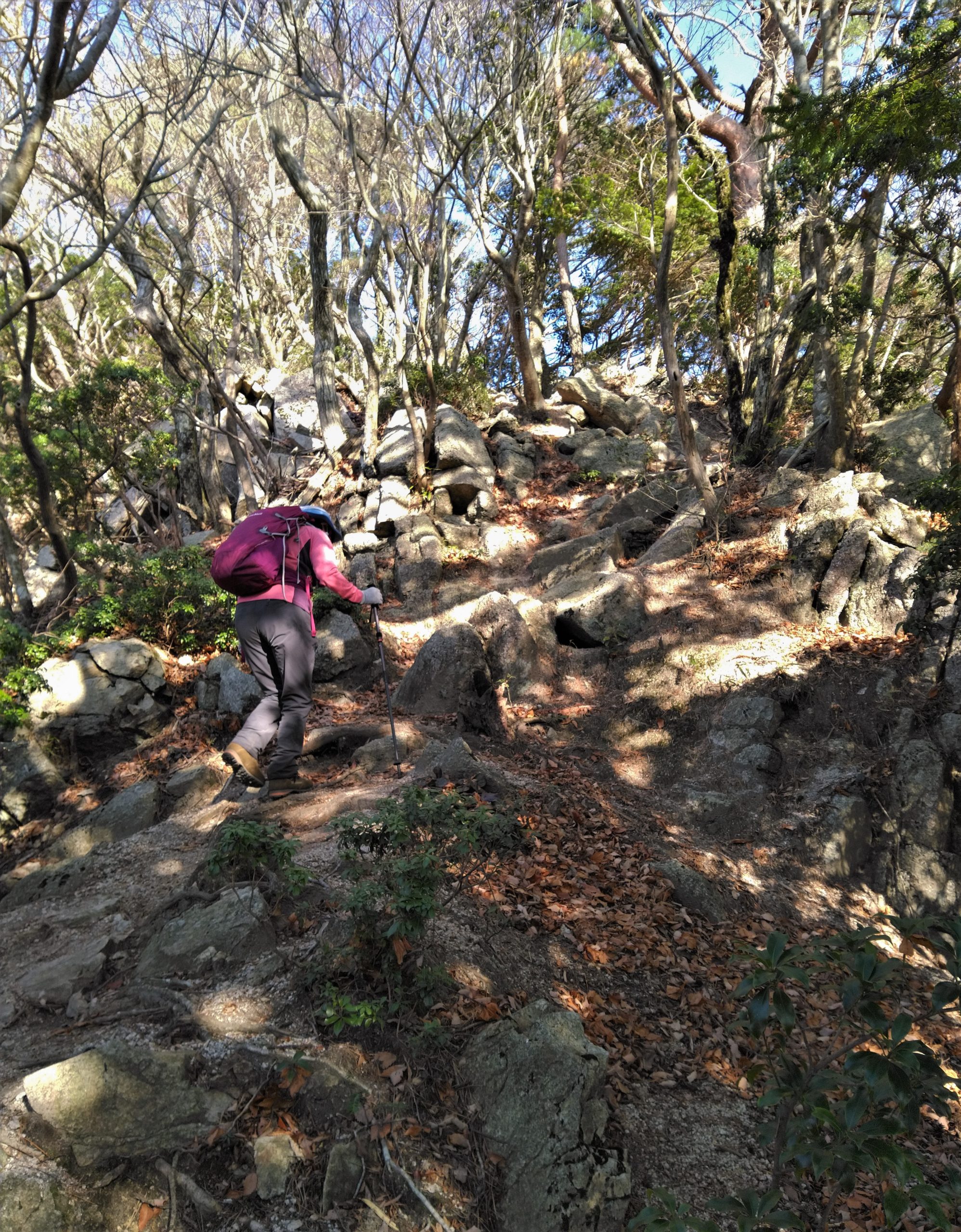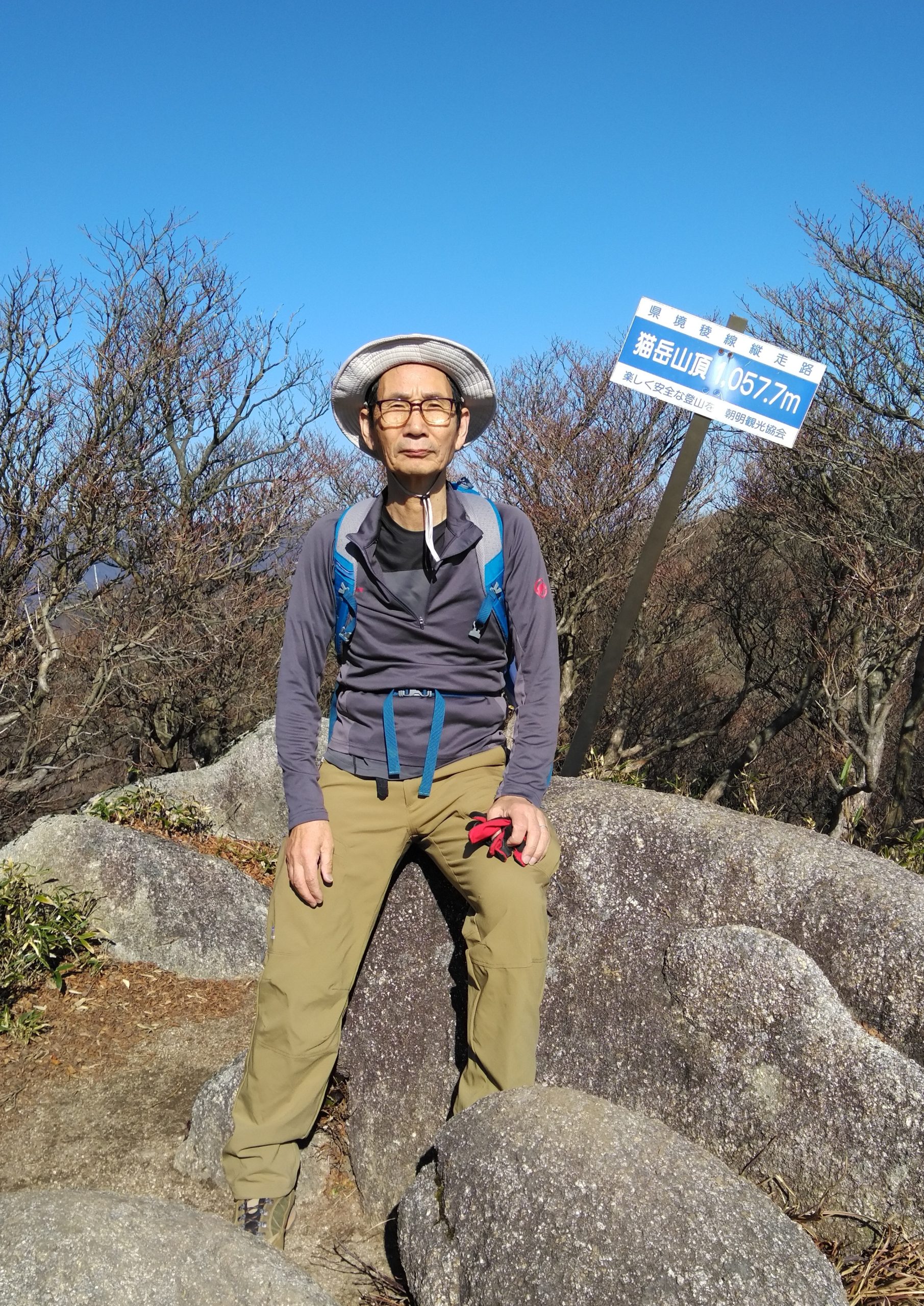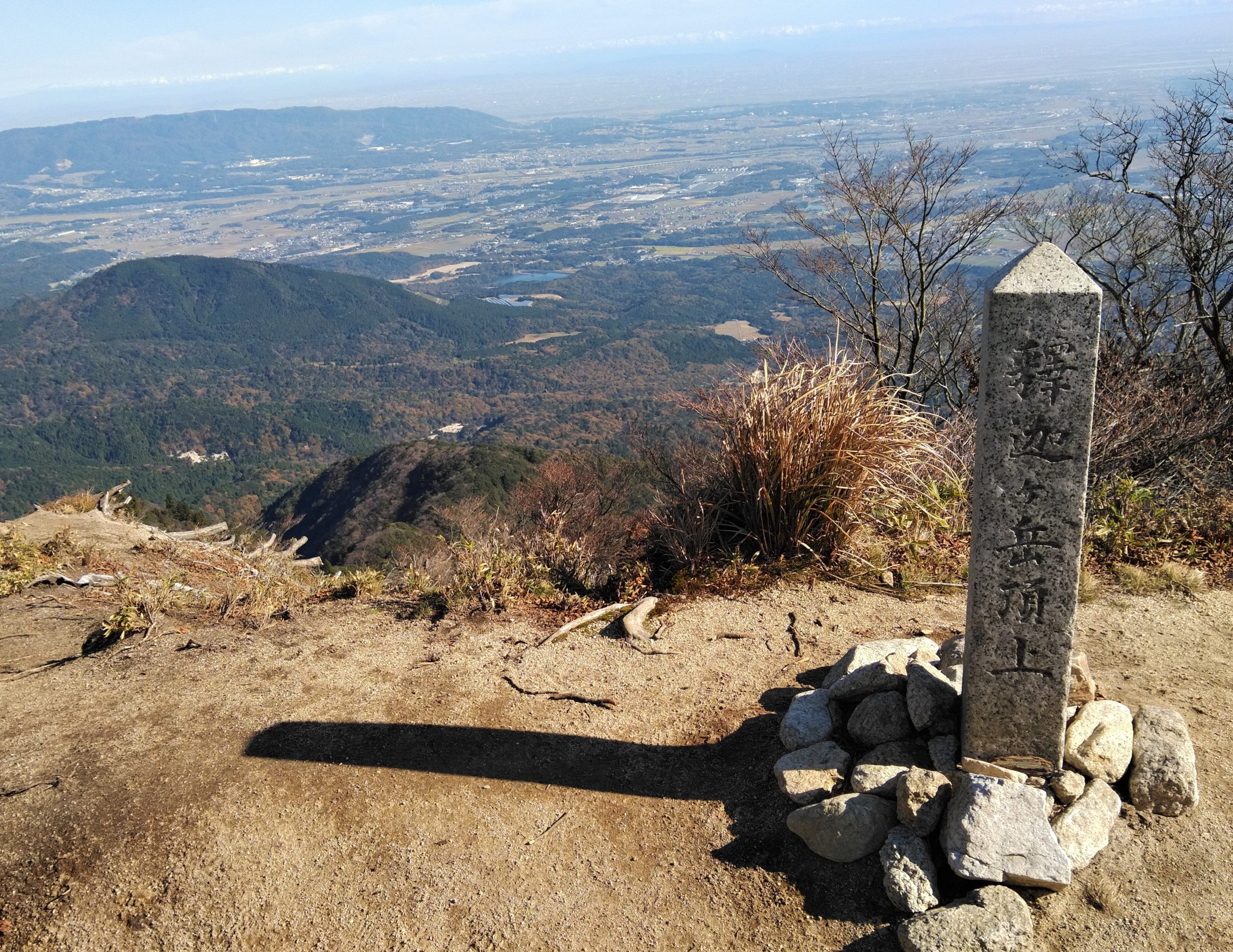 11月27日(金)8:00朝明駐車場に車を止めて、登山届を出して、中尾根登山口を目指した。樹林帯のジグザグ道を上り、花崗岩のやせ尾根を進み鳴滝コバで小休止。急登を上ったり下りたりしながら松尾尾根を過ぎると、最大の難関「大蔭のガレ」に出た。慎重に通り過ぎてさらに急登を上ると、1097mの釈迦ヶ岳最高点「松尾尾根の頭」に着いた。そこで早めの昼食を食べて、少し先にある1092m「釈迦ヶ岳」山頂を目指した。快晴に恵まれて素晴らしい伊勢湾や遠く名古屋のビルまで見える展望を楽しんだ。帰路は「猫岳」を通り、大蔭のガレを振り返りながら展望の良い猫谷コースを下りた。