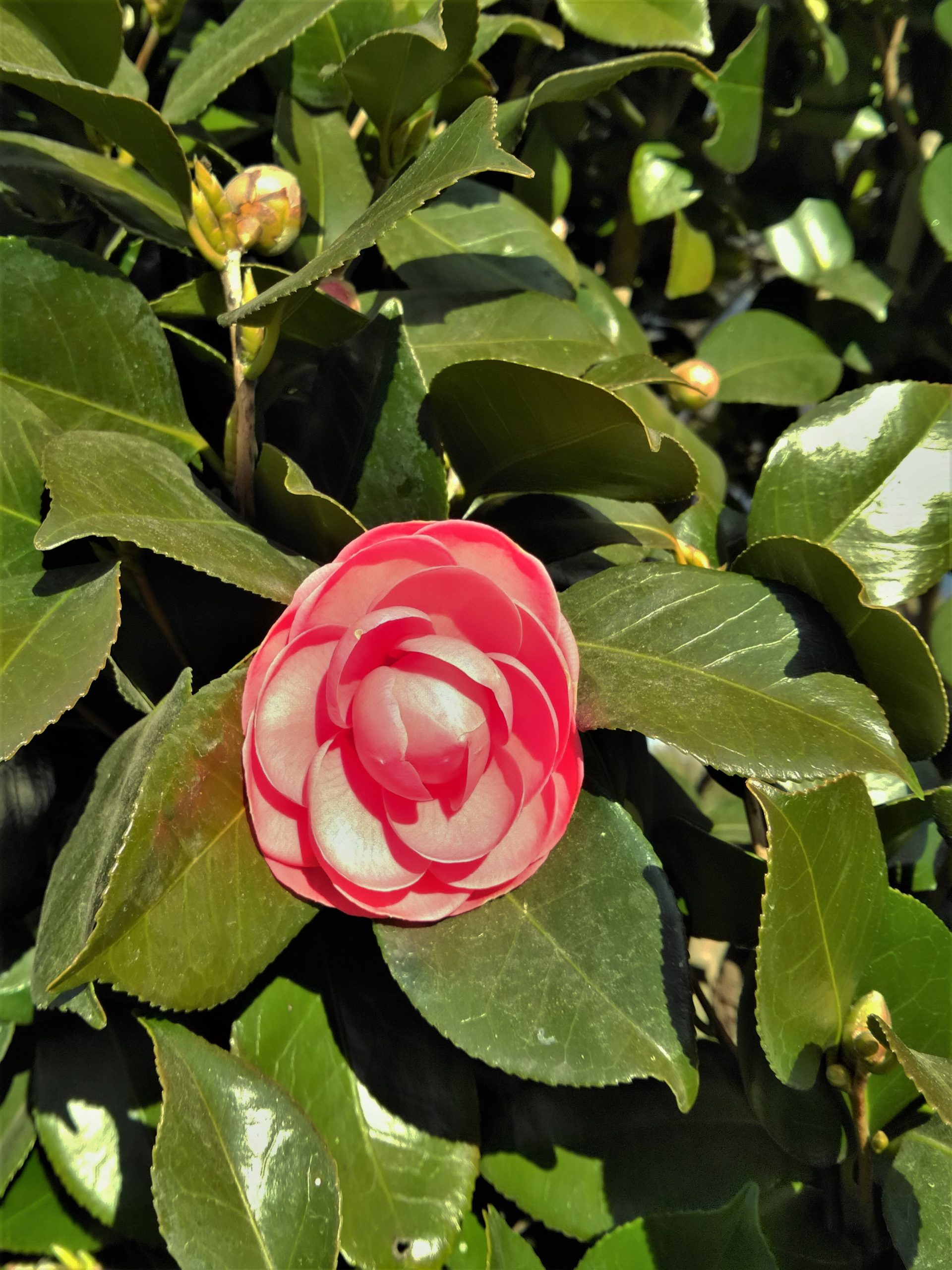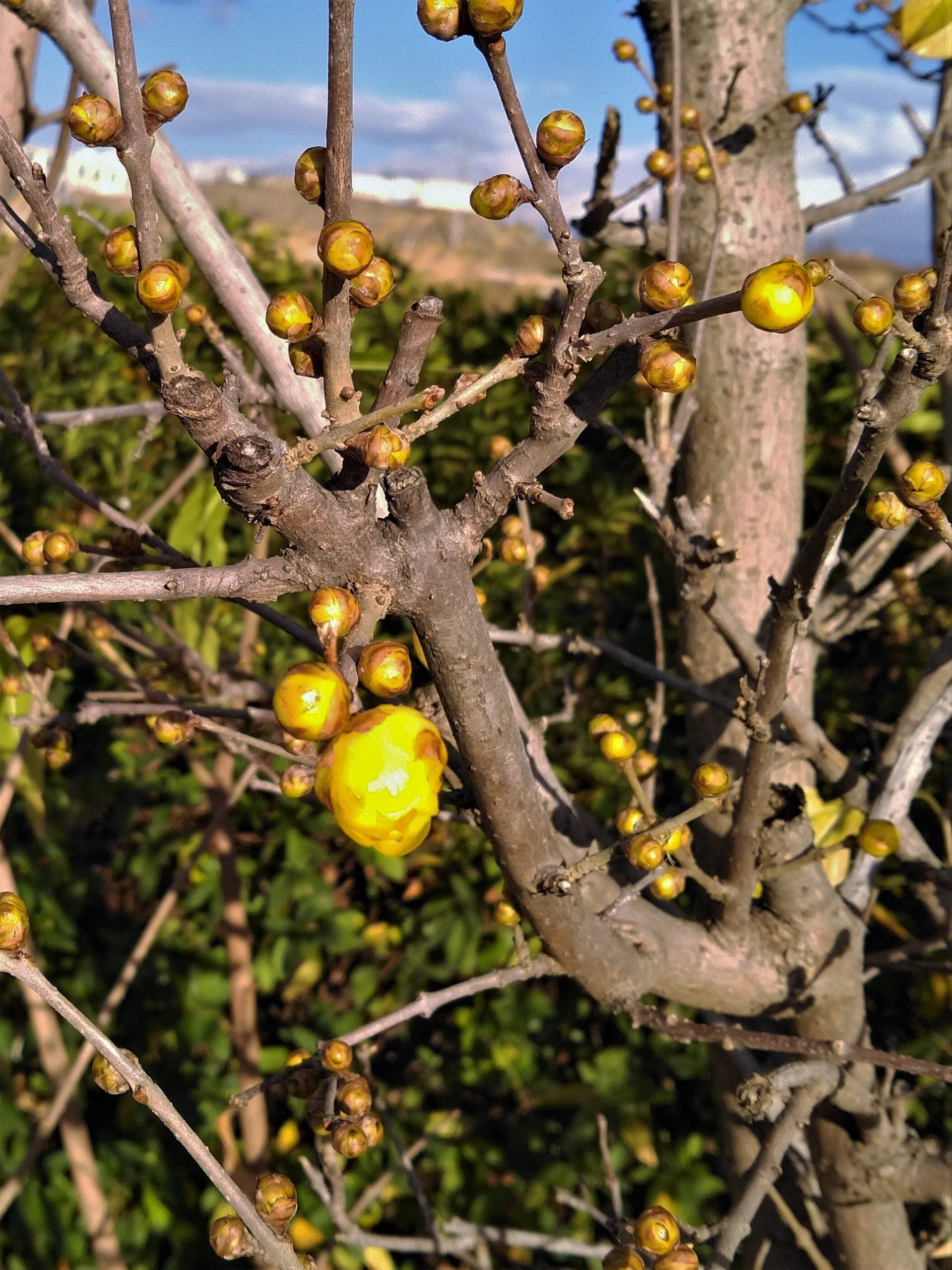 2日(土)令和3年になって最初のジョッギング。気温は10度以下と低かったが、日が照って良い天気だったので、家の中でじっとしていられなくてパークロードをジョッギングした。ロウバイのつぼみが膨らんでいた。白い椿の花が一輪、赤いのが数輪咲いていた。