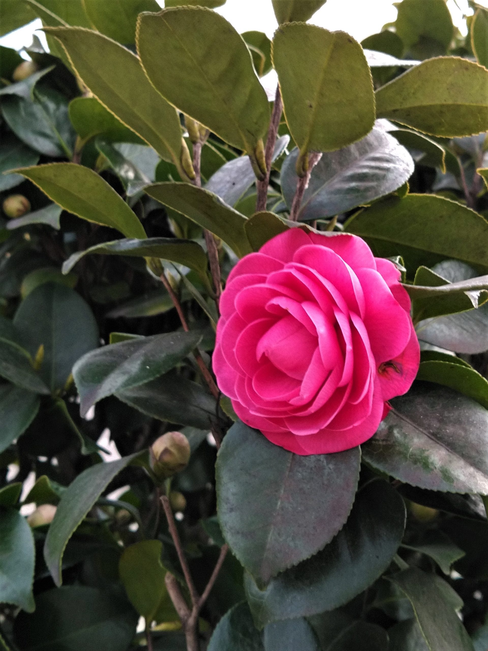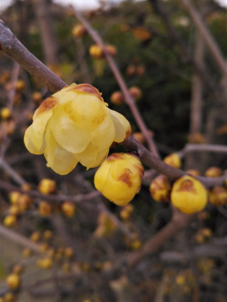 6日(水)今日もいい天気だったので、ジョッギングに行った。ロウバイのつぼみが膨らみ、花も少し開き始めた。咲いている椿の花も少し増えた。梢にモズが止まっていた。復路の北風は相変わらず厳しい。